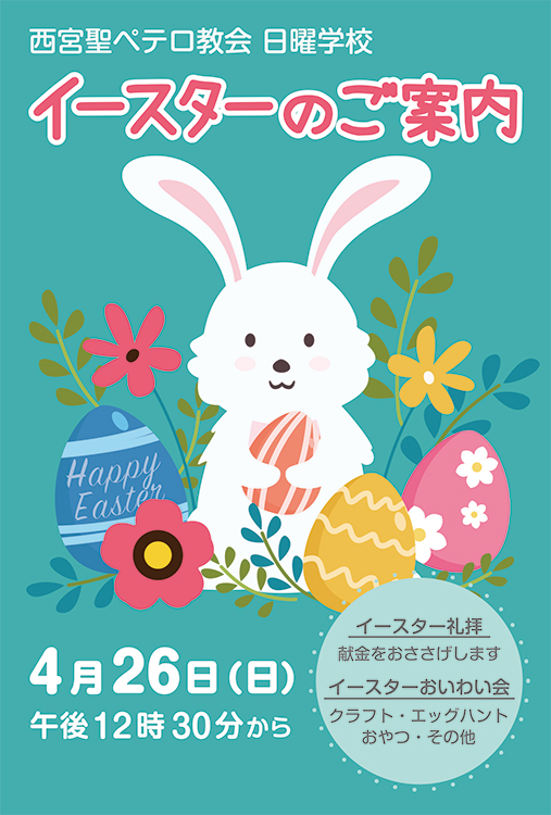 2026年3月22日 / 最終更新日 : 2026年3月22日 stpeter-staff 日曜学校 2026年日曜学校イースターのお知らせ 2026年4月26日(日)午後12:30〜 イースター礼拝 ・献金をおささげします イースターおいわい会 ・クラフト ・エッグハント ・おやつ 他 みなさん どうぞおあつまりください たのしみにおまちしています!